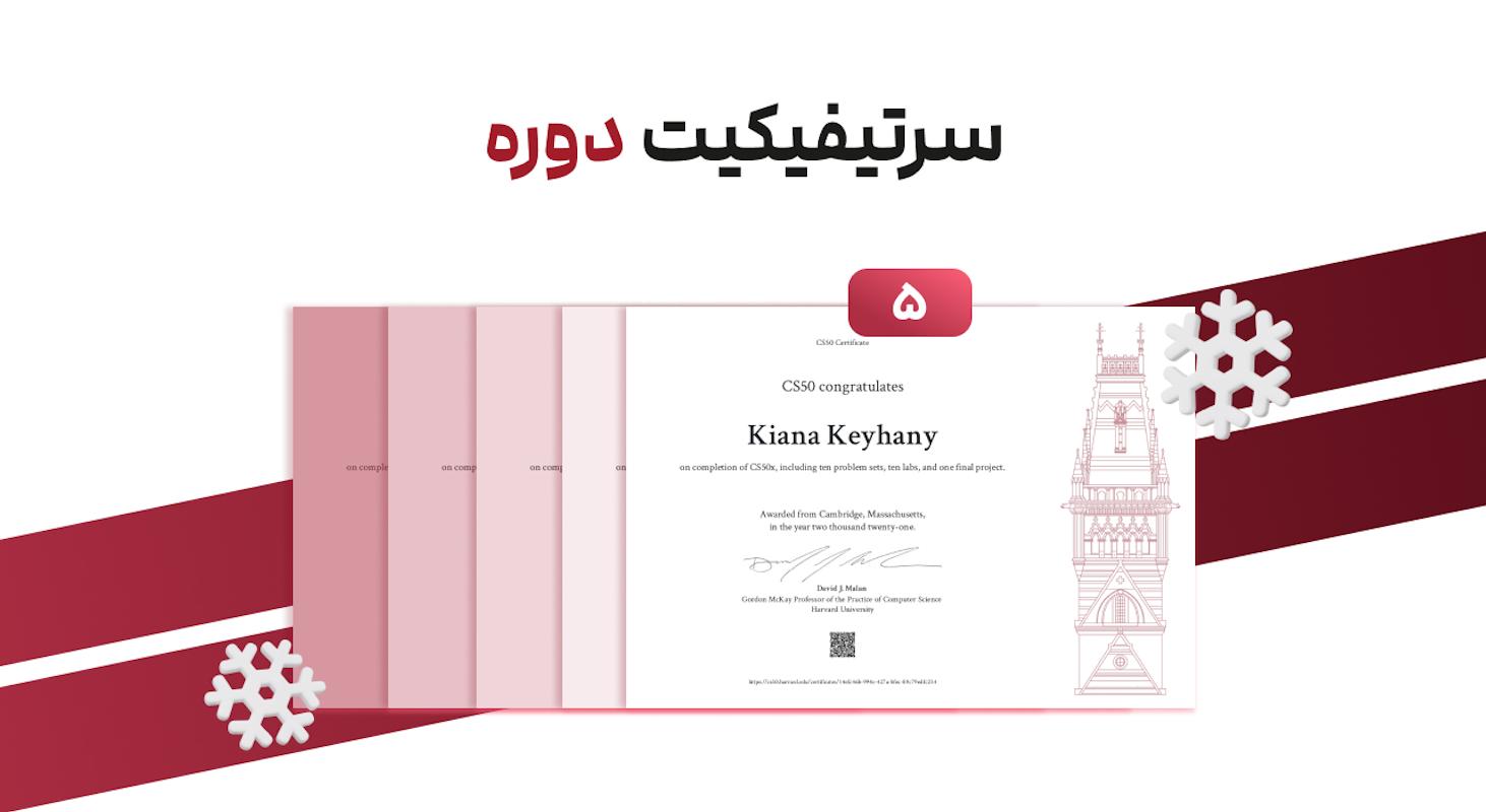 اگه توی تمام تمرین‌های دوره نمره بالای ۷۰ درصد بگیری (تمرین‌هایی که مستقیم روی وبسایت هاروارد آپلود می‌شن)، در نهایت ۵ گواهی معتبر با لینک و کد رهگیری رسمی از دانشگاه هاروارد دریافت می‌کنی.
